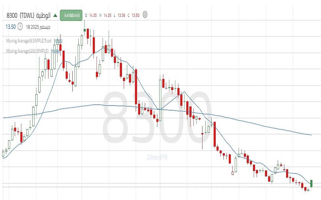 وبدأ سهم الوطنية تداولاته عام 2025 بداية من شهر يناير، باتجاه هابط رئيسي ليتراجع من 26.00 ريال وصولاً للمستويات الحالية عند 13.00 ريال، وذلك مع ملاحظة ضعف ملحوظ في أحجام التداول الشرائية وكان يتخلل الاتجاه الهابط بعض التصحيحات الشرائية واستمر الهبوط  منذ بداية العام وحتى شهر ديسمبر محاولاً إيجاد قاع في شهر ديسمبر.